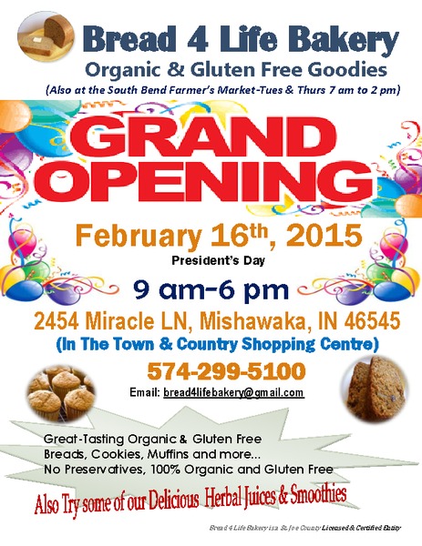 All of Bread 4 Life Products are baked from scratch, with freshly milled flour, all natural, organic products and lots of love. At this Grand Opening There will be great tasting Healthy Breads, Cookies and Muffins etc with No Preservatives.