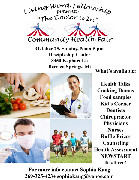 Come and experience a one-of-a-kind health fair, right here in Berrien Springs. Invest in your health. Bring your whole family. They are sure to enjoy it. Learn something new. Assess your health. And have fun. We will be open for just five hours. You don't want to miss it!