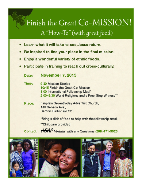 ASAP Ministries presents Finish the Great Co-MISSION! on November 7, 2015 at the Fairplain Seventh-day Adventist Church (140 Seneca Ave, Benton Harbor). Learn what it will take to see Jesus return. Be inspired to find your place in the final mission. Enjoy an international fellowship meal and an afternoon training in cross-cultural ministry with Pastor Scott Griswold.  Programs start at 9:30, 10:45, and 2:00.  For more information, download the poster below or contact ASAP Ministries at 269-471-3026 or office@asapministries.org.