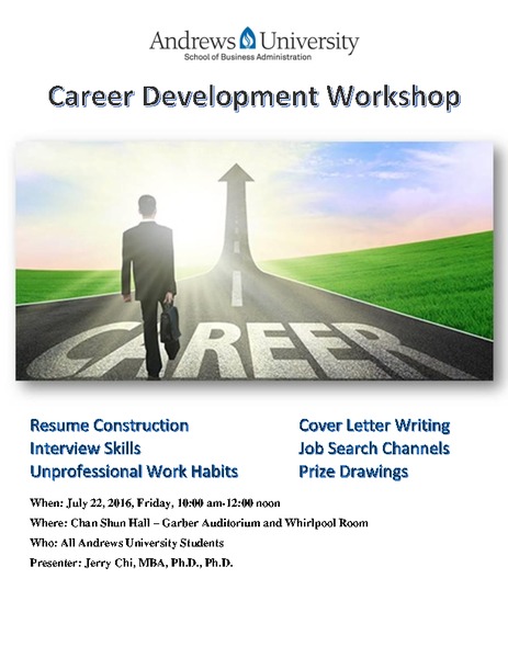 The School of Business Administration is sponsoring a Career Devlopment Workshop conducted by Dr. Jerry Chi where ALL Andrews University students can come learn about resume construction, interview skills, cover letter writing, and more.