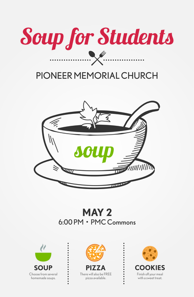 Join us for soup on Tuesday, May 2 at 6:00PM at Pioneer Memorial Church.