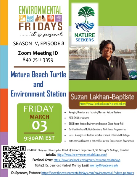 Join us this upcoming Friday, March 3, 2023, for Environmental Fridays, Episode 8, at 9:30 a.m. EST (10:30 a.m. Eastern Caribbean) to listen and learn about "Matura Beach Turtle and Environment Station" by Suzan Lakhan-Baptiste.