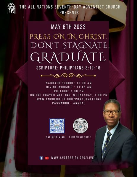 The All Nations Church Family invites you to worship with us as our lead pastor, Martin Hanna speaks on the word "Press on in Christ: Don't Stagnate, Graduate". Adult and children's Sabbath school begins at 10:30 a.m. Divine service begins at 11:45 p.m. We look forward to fellowshiping with you!