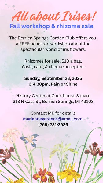 Iris rhizomes will be available for sale at $10 a bag. A demonstration of how to trim and plant them will be part of the workshop.