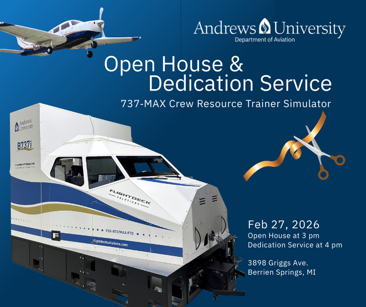 The Department of Aviation warmly invites you to join us for a milestone moment as we celebrate the arrival of our new 737‑MAX Crew Resource Trainer—a full‑scale, 1:1 replica of the Boeing 737 cockpit. This advanced training device represents a major step forward in preparing the next generation of professional pilots at Andrews University.
