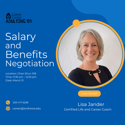 Join us for this interactive workshop that will empower you with the skills and confidence to navigate salary and benefits negotiations during the hiring process. Attendees will learn effective strategies for advocating their value, researching competitive compensation packages, and articulating their worth to potential employers. The session will also demystify common on-the-job benefits such as health insurance, retirement plans, and professional development opportunities, helping you understand how to evaluate and leverage these offerings. The workshop will take place on Tuesday, March 31, from 11:30 am to 12:20 pm in Chan Shun 108. Open to all majors, including graduate students. Distance learning students can participate through our hybrid option by contacting career@andrews.edu.
