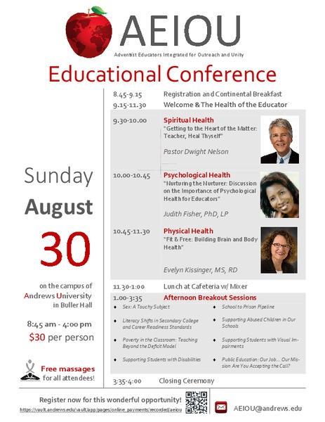 The AEIOU Educational Conference will be hosted at Andrews University on Sunday, Aug. 30, from 8:30 a.m.-4:00 p.m. Guest presenters include Dwight Nelson, Judith Fisher and Evelyn Kissinger. Registration is required and there is a $30 fee. ... read moreSpanish Church Day-Long Seminar