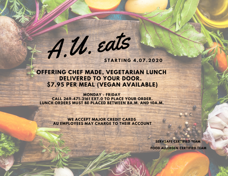 AU Eats Menu for May 4–8, 2020. To place your order, please call 269-471-3161, option 1, between the hours of 8 a.m. and 10 a.m., Monday–Friday.