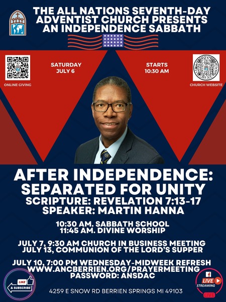 Join the All Nations Seventh-day Adventist Church for a wonderful worship experience, this Saturday, July 6, at 11:45 a.m., as Martin Hanna presents "After Independence: Separated For Unity." Adult, Children's and Youth Sabbath School begins at 10:30 a.m.... read more
