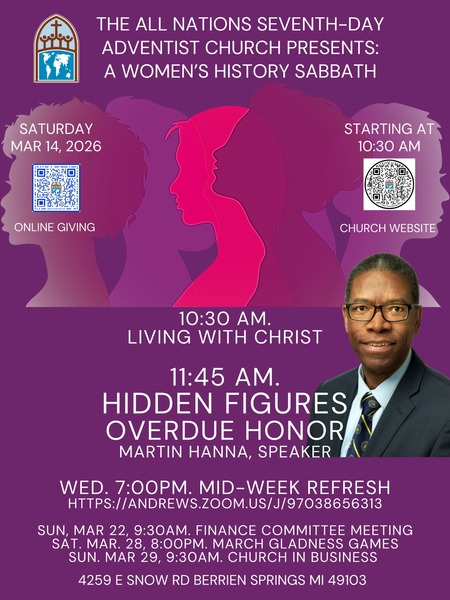 Join us for our worship experience at the All Nations SDA Church this Saturday, March 8, at 11:45 am, as Martin Hanna presents "Hidden Figures: Overdue Honor." Adult and Children's Sabbath School begins at 10:30 am. We look... read more