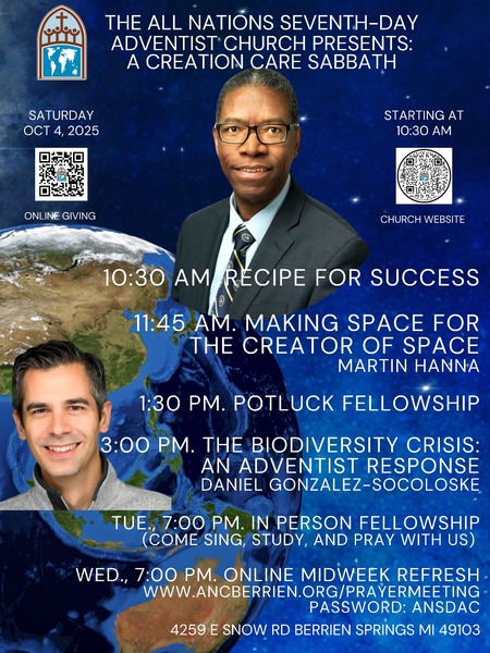 Join us for a Creation Care worship experience at the All Nations SDA Church this Sabbath, October 4, at 11:45 am, as Martin Hanna presents "Making Space for the Creator of Space." Adult and Children's Sabbath School begins... read more
