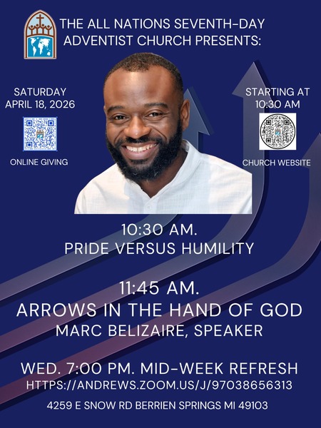 Join us for our worship experience at the All Nations Seventh-day Adventist Church this Saturday, April 18, at 11:45 a.m., as Marc Belizaire speaks on "Arrows in the Hand of God." Adult and Children's Sabbath School begins at...