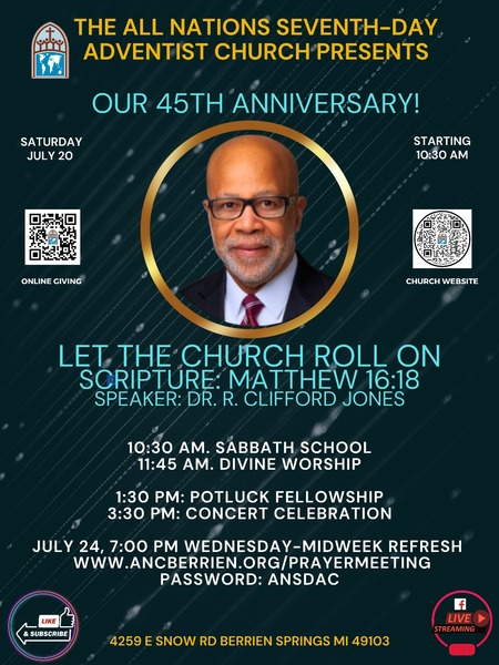 Join us for our 45th Anniversary, this Saturday, July 20 @ 11:45, as Clifford Jones presents "Let The Church Roll On." Sabbath School begins @ 10:30 am. Lunch is provided followed by a celebration concert @ 3:30 pm. ... read more